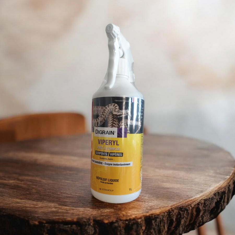 DIGRAIN® VIPERYL est une solution répulsive spécialement conçue pour repousser les serpents tels que les vipères, couleuvres et aspics, sans leur nuire. Facile à utiliser, ce répulsif liquide s’applique directement sur les zones à protéger, où il forme une barrière olfactive qui incommode les reptiles et les empêches de pénétrer dans les espaces traités. Idéal pour sécuriser les habitations, dépendances, les jardins, terrasses, les abords de piscines ou encore les zones agricoles et d’élevage sensibles, ce produit respecte la faune puisqu’il éloigne sans tuer. Prêt à l’emploi, il offre une utilisation immédiate, agit sur différentes espèces de serpents et réduit efficacement les risques d’intrusion.